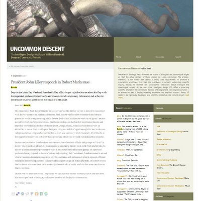 The punishment for Marks is that his ”lab” (we’ll get to that in a moment) was shut down and his website taken offline because the lab's research was perceived as being supportive of intelligent design. To recap, in June of this year the website went online. In July, ID The Future aired its interview with Marks about the Evolutionary Informatics Lab, and a scant dozen days later the website was erased from the net. Is academic freedom or freedom of scientific inquiry alive and well at Baylor University? (Journalist Denyse O’Leary has documented the exact timeline of events at uncommondescent.com, and has provided the backstory of academic persecution at Baylor.)